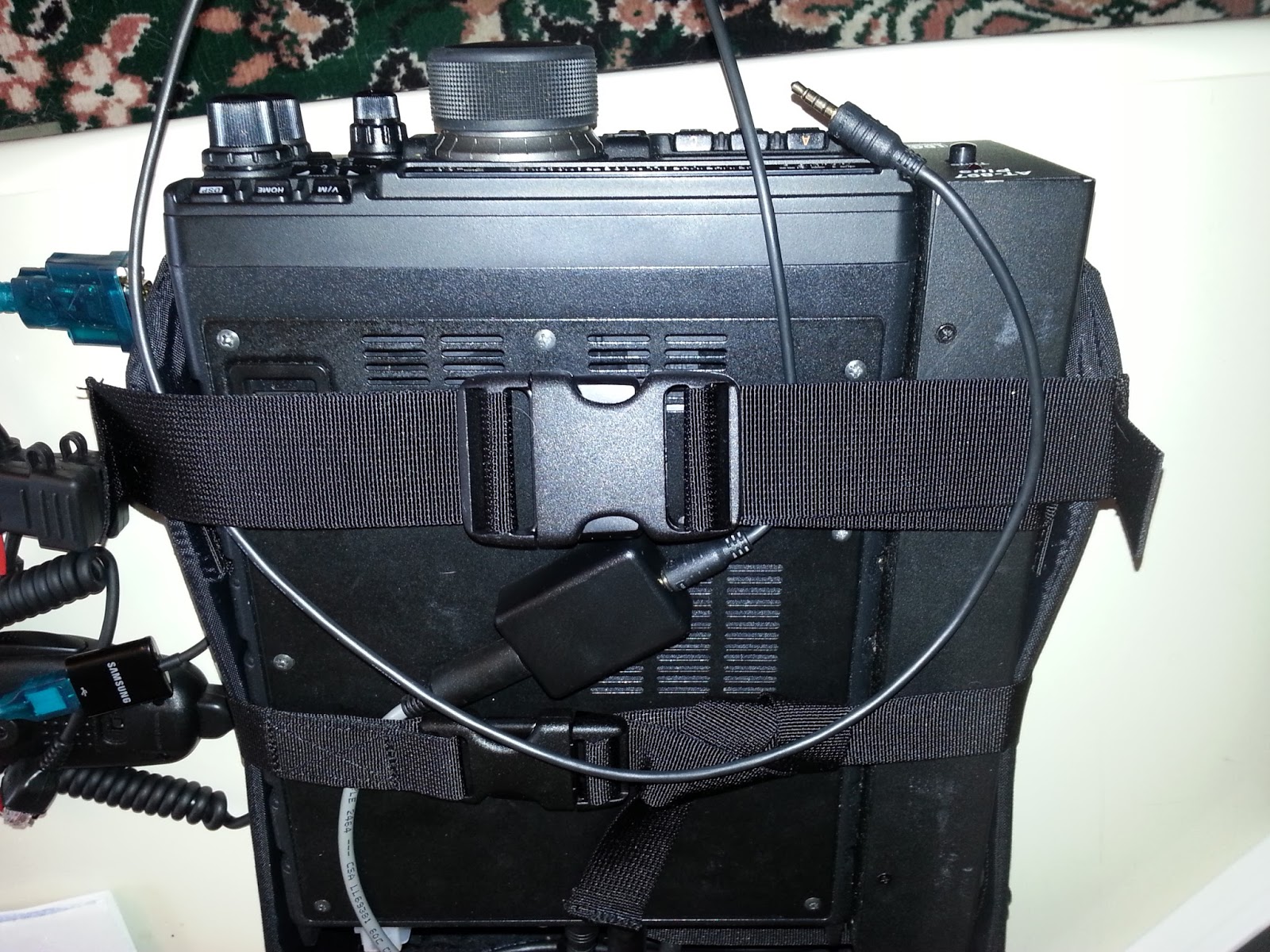 | Radio in a bag, on a bench., antenna cable coiled in a front pouch/space. Notice the one piece going up and over the top of the bag? It enters the bag via hole usually used for a hydration tube. |